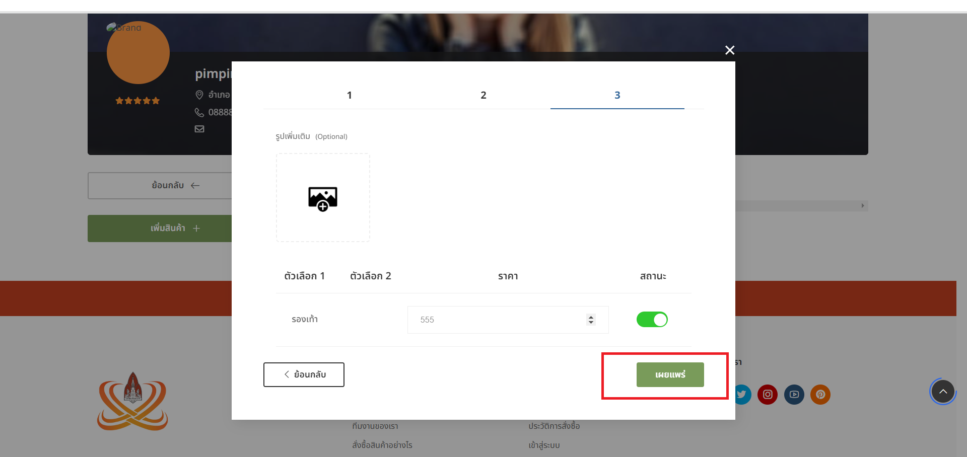 คลิกที่ "เมนูร้านค้า" และคลิกที่ "เพิ่มสินค้า" จากนั้นจึงกรอกรายละเอียดสินค้าที่ต้องการขาย และกด "เผยแพร่" เป็นอันเสร็จเรียบร้อย
